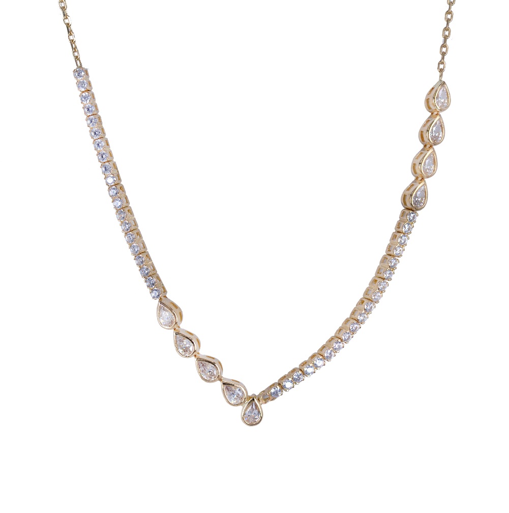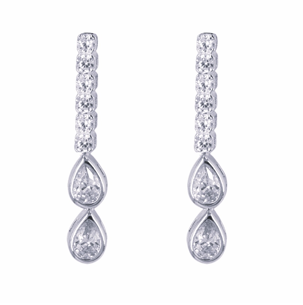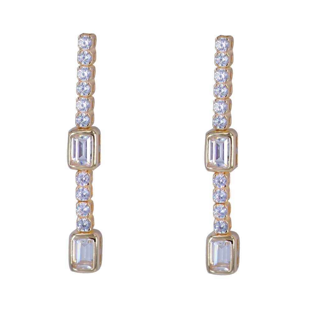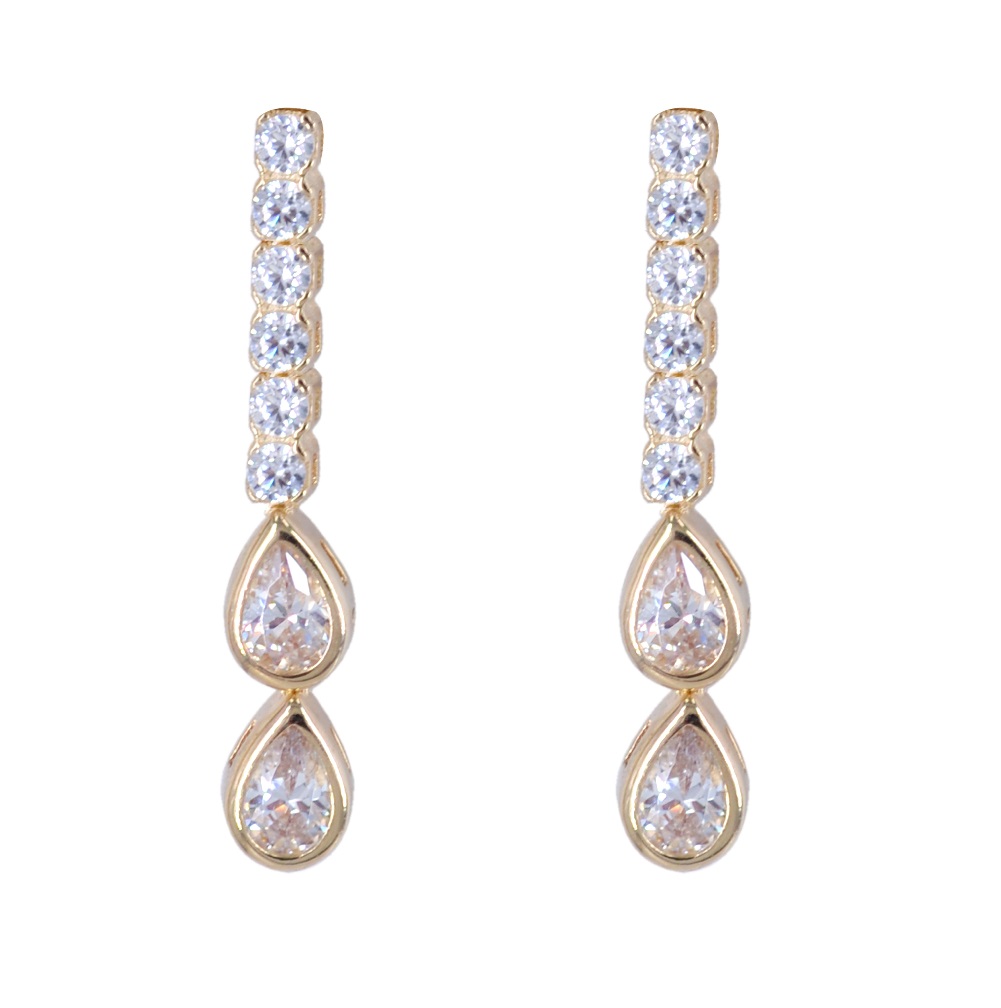 Χρυσά σκουλαρίκια κρεμαστά 14 Καρατίων με ιδιαίτερο μοντέρνο σχέδιο από μονή σειρά με ζιργκόν Swarovski η οποία συνεχίζει με σειρά 2 πετρών σε σχέδιο δάκρυ ζιργκόν Swarovski.
