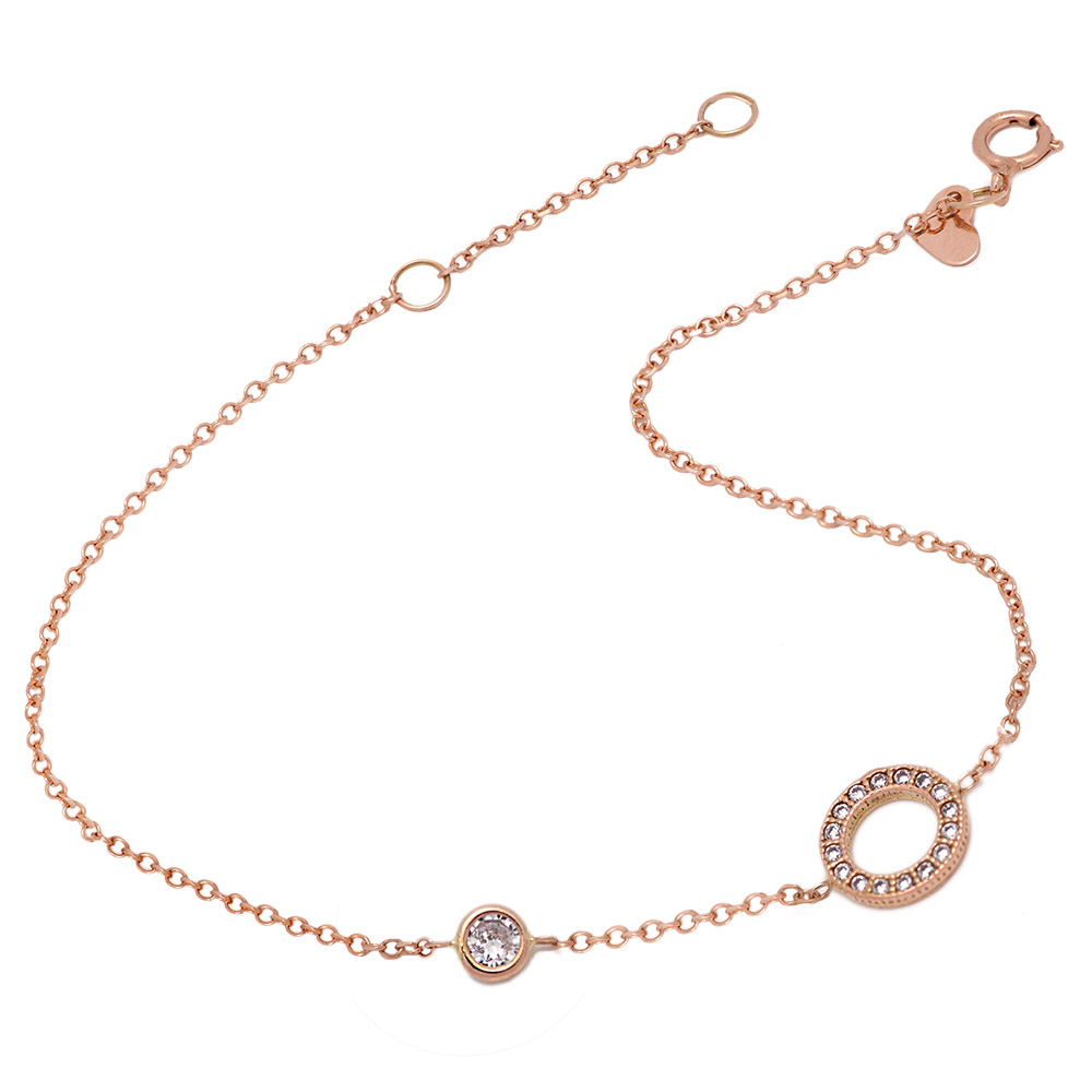 Χρυσό ροζ βραχιόλι 9 Kαρατίων με διακοσμητικό ματάκι από λευκές και μαύρες πέτρες ζιργκόν.
