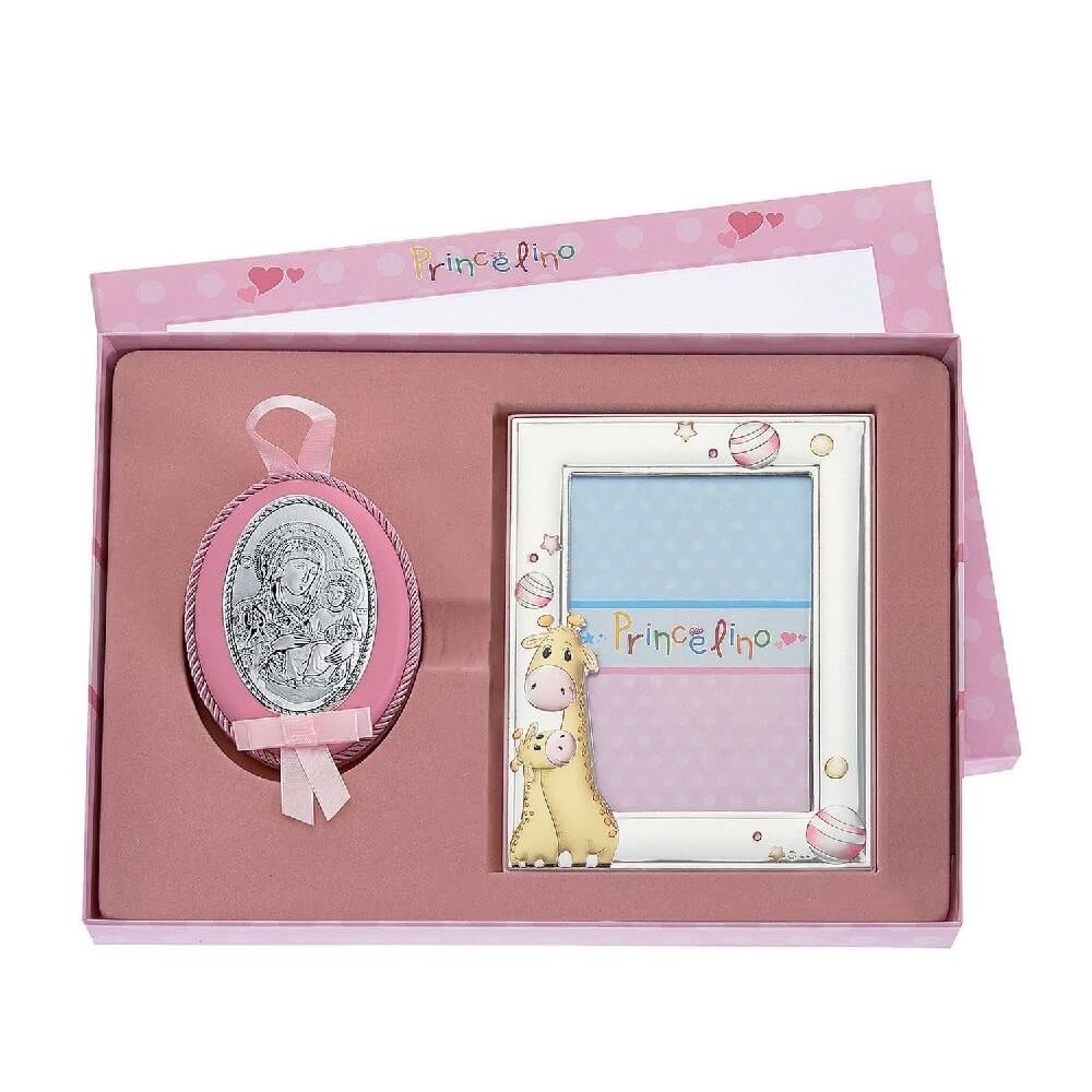 Ασημένιο παιδικό σετ 925 με κορνίζα Γέννηση και εικόνα κούνιας Παναγία και Χριστός σε ροζ απόχρωση για κορίτσι.