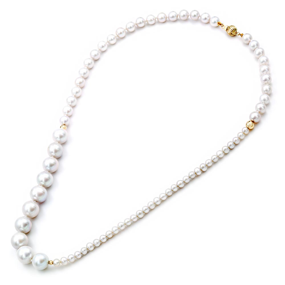 Κολιέ με λευκά μαργαριτάρια γλυκού νερού Fresh Water Pearl διαμέτρου 4,0 έως 10,0 χιλιοστών σε σχήμα Round (στρόγγυλο) ποιότητας ΑΑΑ. Ανάμεσα στην αλλαγή μεγέθους των μαργαριταριών υπάρχουν 3 χρυσές μπίλιες 14 καρατίων. Διαθέτει επίσης κούμπωμα διπλής ασφαλείας από χρυσό 14 καρατίων. Είναι δεμένο με μεταξωτό νήμα που δημιουργεί κόμπους ενδιάμεσα στα μαργαριτάρια για λόγους προστασίας και ασφάλειας. Το συνολικό του μήκος είναι 45 εκατοστά (Princess) το ιδανικό και προτεινόμενο μήκος κολιέ. Μπορείτε όμως να το παραγγείλετε σε όποιο μήκος επιθυμείτε.