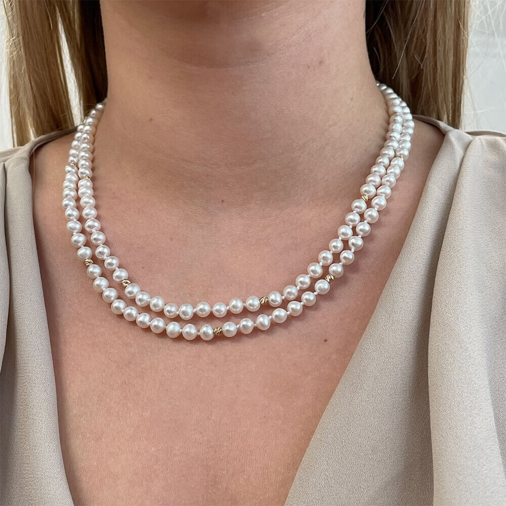 Κολιέ με 2 σειρές λευκά μαργαριτάρια γλυκού νερού Fresh Water Pearl διαμέτρου 5,0 έως 5,5 χιλιοστών σε σχήμα Round (στρόγγυλο) ποιότητας ΑΑΑ. Ανάμεσα στα μαργαριτάρια υπάρχουν 15 χρυσά στοιχεία 14 καρατίων με την τεχνική του διαμανταρίσματος. Διαθέτει κούμπωμα διπλής ασφαλείας από χρυσό 14 καρατίων. Είναι δεμένο με μεταξωτό νήμα που δημιουργεί κόμπους ενδιάμεσα στα μαργαριτάρια για λόγους προστασίας και ασφάλειας. Το συνολικό του μήκος είναι 45 εκατοστά (Princess) το ιδανικό και προτεινόμενο μήκος κολιέ. Μπορείτε όμως να το παραγγείλετε σε όποιο μήκος επιθυμείτε.