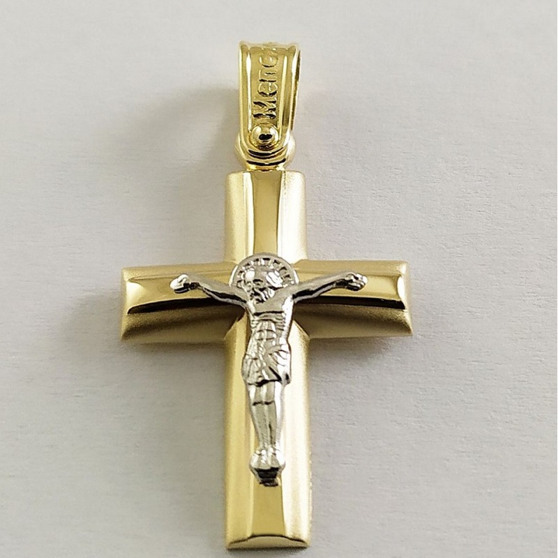 Χρυσός σταυρός 14 Καρατίων, γυναικείος, με λουστρέ φινίρισμα. H οριζόντια πλευρά του σταυρού διακοσμείται με μία λευκόχρυση γραμμή, η οποία καταλήγει σε μια λευκόχρυση κορώνα με τρεις λευκές πέτρες ζιργκόν Swarovski.