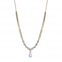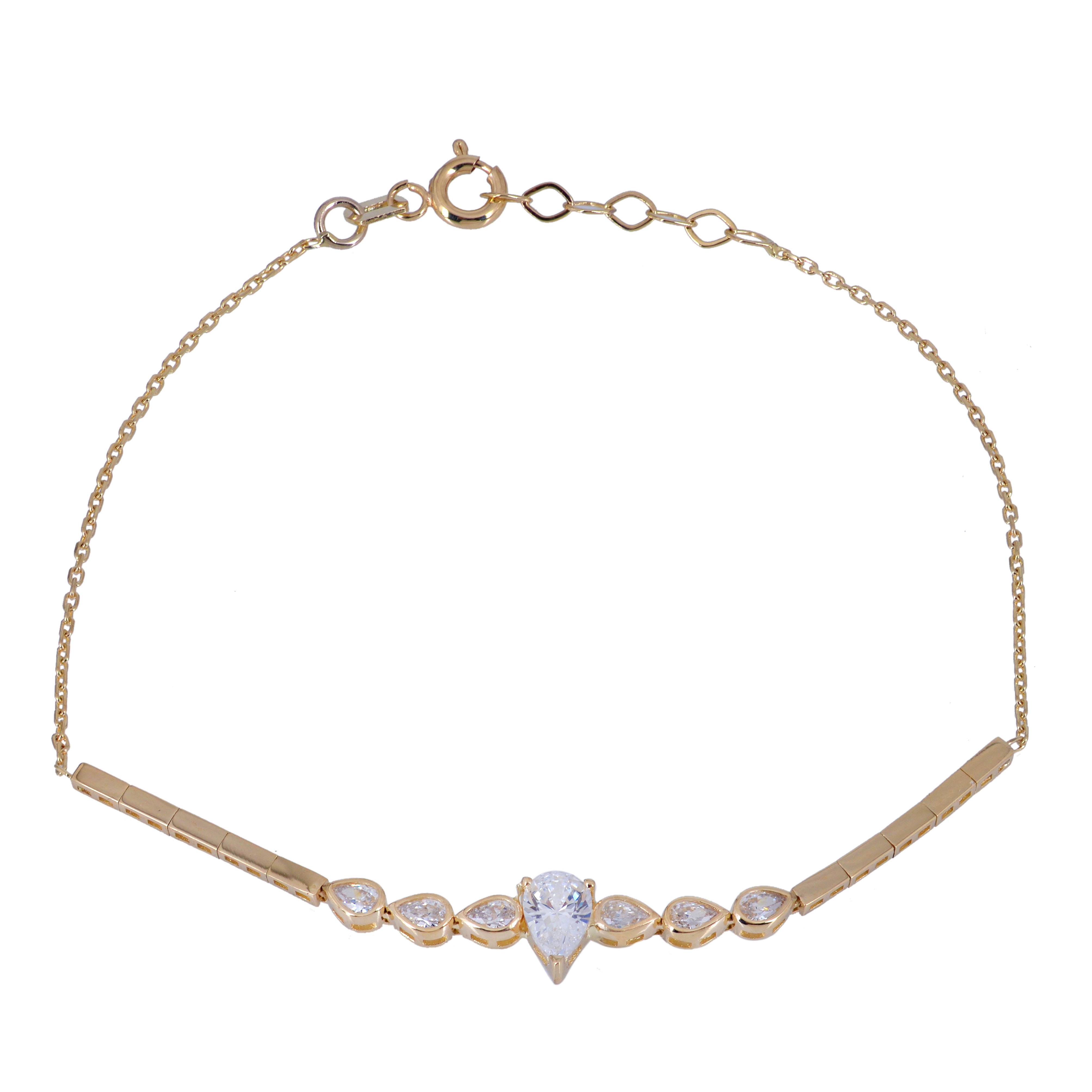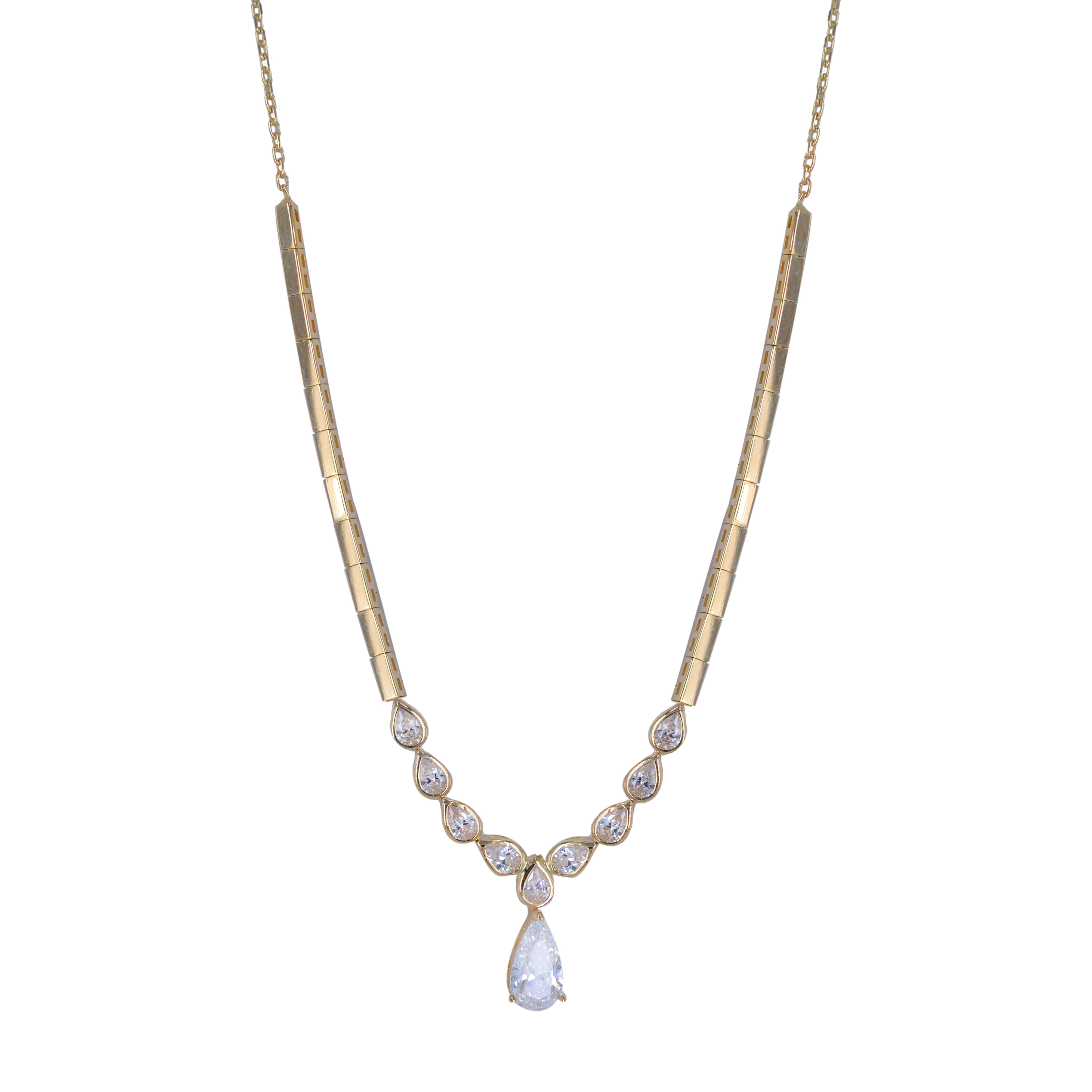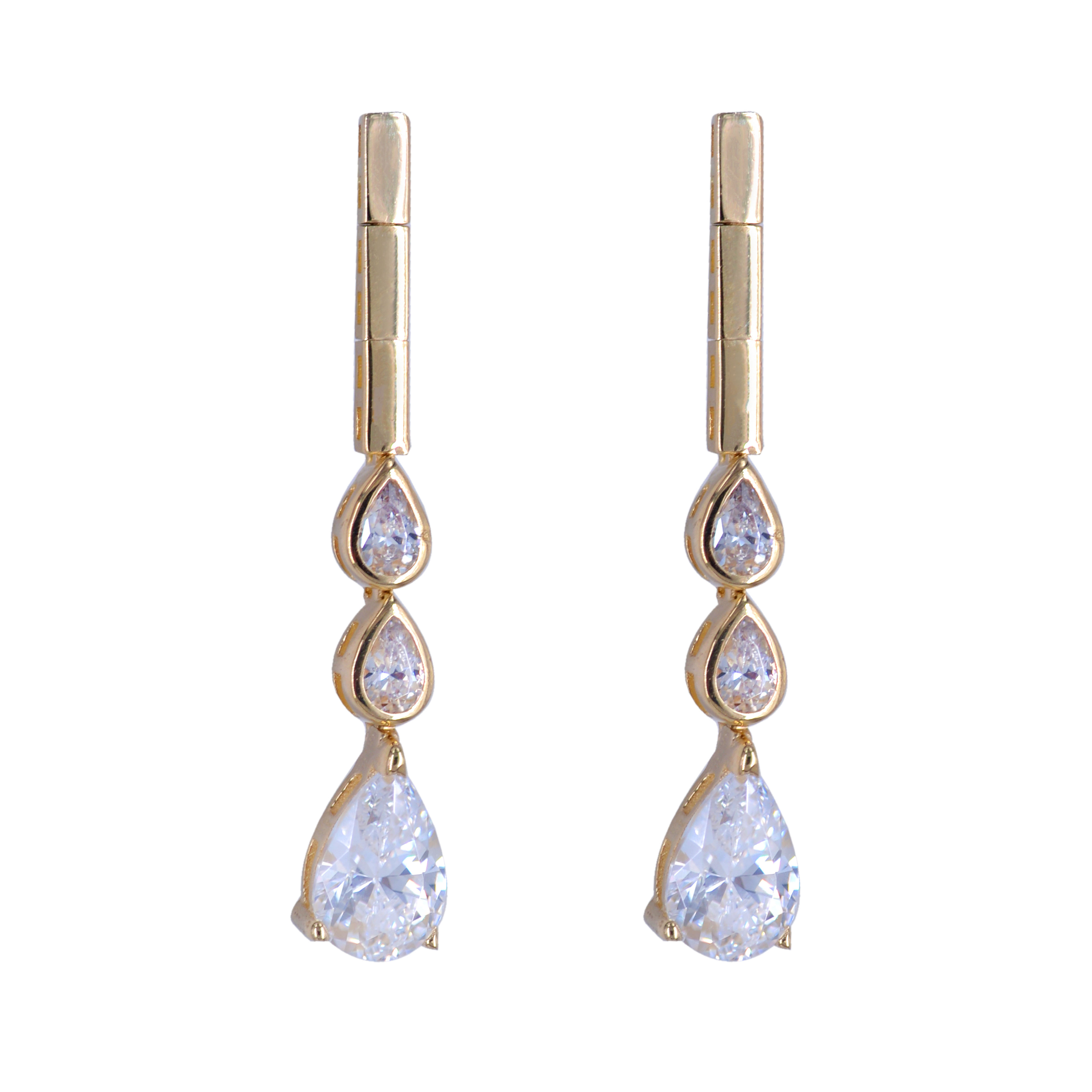 Σετ χρυσό 14 Καρατίων, με ιδιαίτερο μοντέρνο σχέδιο από ζιργκόν Swarovski με μονόπετρο σχέδιο δάκρυ περιβαμμόμενο από πιο μικρές πέτρες ζιργκόν Swarovski και ορθογώνια στοιχεία.