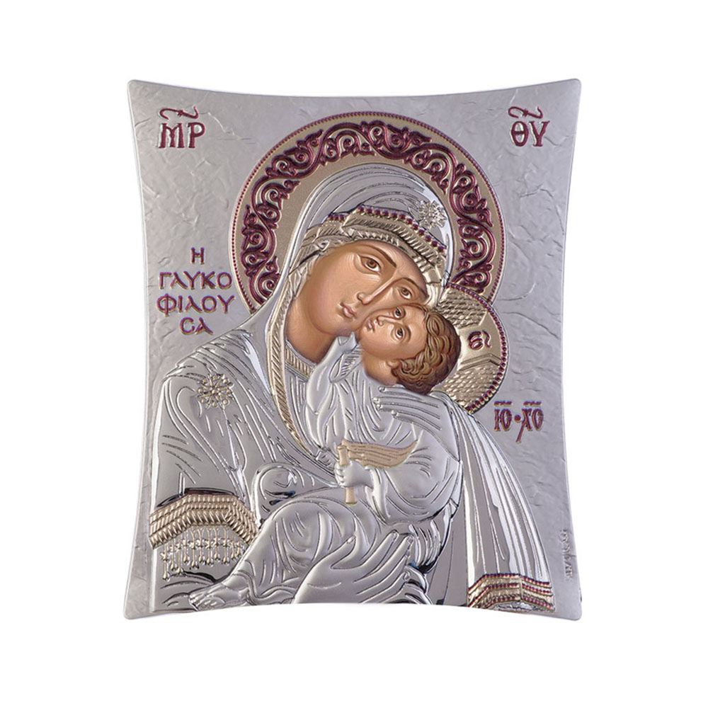 Ασημένια εκκλησιαστική εικόνα, ασύμμετρη, που απεικονίζει την Παναγία Γλυκοφιλούσα.