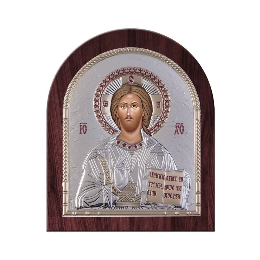 Ασημένια εικόνα 925 με θέμα τον Χριστό με επίχρυσες λεπτομέρειες και ξύλινο οβάλ πλαίσιο.