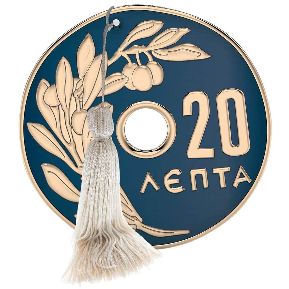 Γούρι επιτραπέζιο σε σχέδιο εικοσάρα - εικοσάλεπτης δραχμής με ένα κλαδί ελιάς. Σύμβολο ευημερίας, δύναμης και ελπίδας. Ιδανική επιλογή είτε για το σπίτι σας είτε για δώρο σε κάποιο αγαπημένο πρόσωπο.